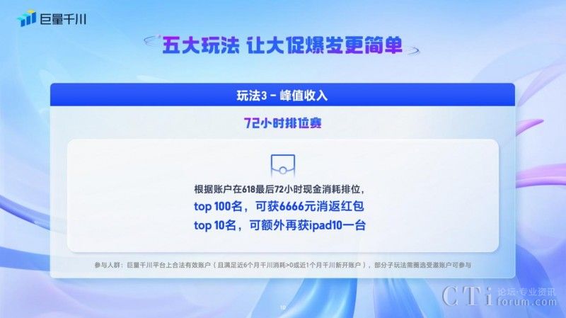 三、「72小時排位賽 」:針對巨量千川平臺上合法有效賬號,且滿足近6個月千川消耗>0或近1個月千川新開賬戶,按照商家的峰值收入可以參與72小時排位賽,根據(jù)賬戶在618最后72小時現(xiàn)金消耗進(jìn)行排位,排位Top100的商家可得6666元消返紅包,Top10可額外再得ipad10一臺。