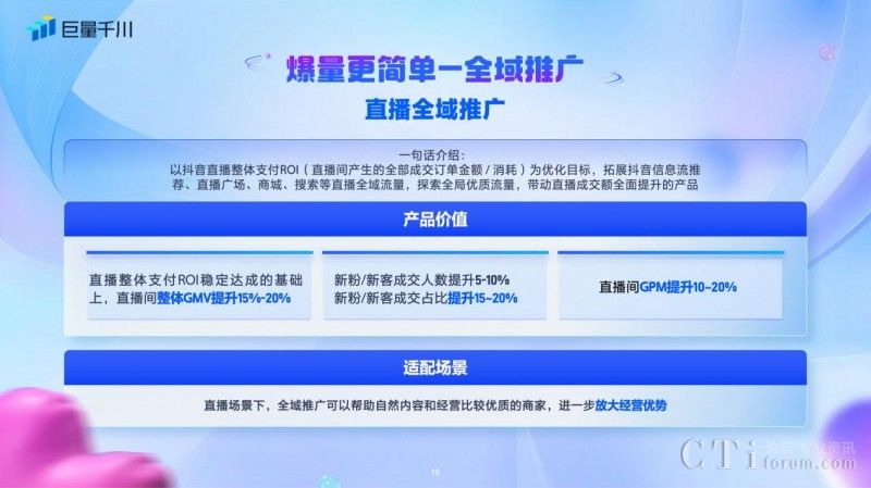 獲取生意增量是商家生意經(jīng)營的重中之重,升級后的全域推廣分為直播全域推廣和商品全域推廣,讓爆量變得更簡單。直播全域推廣打通廣告和自然流量,以抖音直播整體ROI為優(yōu)化目標(biāo),拓展抖音信息流推薦、直播廣場、商城、搜索等直播全域流量,帶動直播成交額全面提升,放大直播生意,直播間整體GMV提升15%~20%,新客/新粉成交占比提升15%~20%。