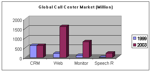 。。在1999年,全球呼叫中心應用軟件的市場總值為29億美元,到2003年這一數(shù)字將增長近三倍,達到85億美元。這一增長主要來源于對基于互聯(lián)網(wǎng)呼叫應用軟件以及呼叫監(jiān)控解決方案的需求。Data-monitor 市場分析專家在1999年針對呼叫中心軟件市場進行調研,具體數(shù)字詳見下表: