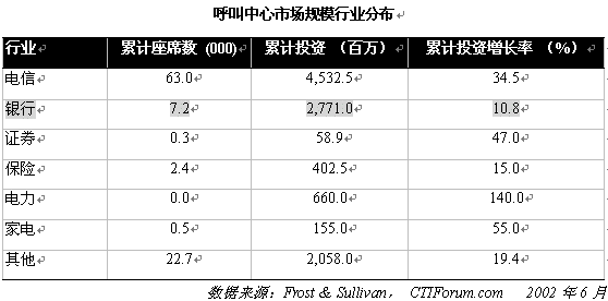 。。中國呼叫中心市場規(guī)模難于確定。根據(jù)CTIForum 的統(tǒng)計數(shù)字,截止到2001年,中國呼叫中心座席總數(shù)達到96,200個,市場規(guī)模達到106.38億元,分別較去年同期增長51.6%,55.2%。2001年,中國呼叫中心市場規(guī)模在各行業(yè)中的分布如下表所示: