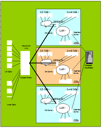 。。網(wǎng)絡式呼叫中心定義如下:該呼叫中心具備轉移呼叫來話的能力,可以在沒有可以利用的客戶服務代表的時候,將來話轉移給另一個呼叫中心。這種來話路由的功能是即復雜又初級,該功能可以由呼叫中心管理人員或者電話服務提供商所控制。對于網(wǎng)絡式呼叫中心的設計而言,從根本上來說與獨立式呼叫中心非常相似,只是具備了內(nèi)部聯(lián)網(wǎng)線路,或者稱為虛擬專用網(wǎng)(VPN)。在同一個網(wǎng)絡框架下,每個呼叫中心之間都配置了相同的設備,包括電話程控交換機、ACD、IVR和CTI等,就其中的某一個呼叫中心而言又是相對獨立的。與獨立式呼叫中心相比,網(wǎng)絡式呼叫中心最顯著的特點是將各個獨立的呼叫中心相連,包括語音信息與數(shù)據(jù)信息。這種手段有ISDN,E-1,甚至利用VoIP的方式。請見下圖。