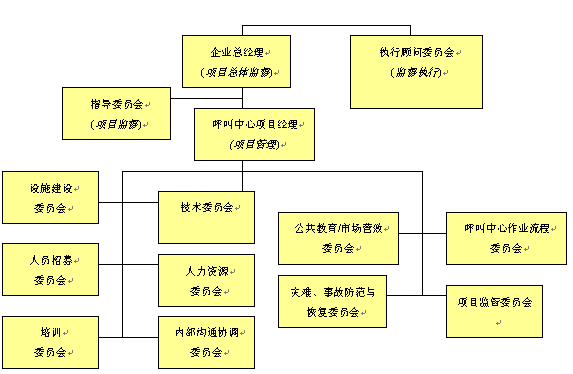 。。對于呼叫中心建設(shè)項目實(shí)施的規(guī)劃是一個需要付出巨大心血與努力的階段,這個階段需要企業(yè)或組織機(jī)構(gòu)所有人員的廣泛參與和專家意見。對于呼叫中心運(yùn)營的規(guī)劃,相對與呼叫中心建設(shè)項目而言則顯得有些"特殊",它意味著整個呼叫中心建設(shè)項目團(tuán)隊不可能有全部的時間花費(fèi)在運(yùn)營規(guī)劃議題上。因此,我們可以將全部項目規(guī)劃工作與任務(wù)拆分成若干個規(guī)劃細(xì)項,這將保證有較強(qiáng)的可操作性。我們建議采取的方式是將整個項目實(shí)施規(guī)劃團(tuán)隊拆分成負(fù)責(zé)各個專項實(shí)施的小組委員會或附屬委員會。這些小組委員會將集中關(guān)注各自特定的項目實(shí)施上,當(dāng)有需要時,與其他各小組進(jìn)行交流與溝通,并在相關(guān)問題上達(dá)成一致。按照以上項目組織管理架構(gòu)其目的是,在項目實(shí)施的關(guān)鍵環(huán)節(jié)和領(lǐng)域,能產(chǎn)生出更具深度的規(guī)劃方案。這樣操作同時可以使更多的人員參與進(jìn)來,并有利于增強(qiáng)各個小組的責(zé)任感,有助于項目的成功實(shí)施。以下的項目指導(dǎo)委員會組織架構(gòu)不是任何呼叫中心建設(shè)項目都能適用的,但是它在某種程度上已經(jīng)為呼叫中心項目規(guī)劃提出了一個基本方針,按照這個思路它將保證項目的成功實(shí)施。而對于規(guī)模較小的呼叫中心項目,以上的組織架構(gòu)成員將扮演多重角色,并負(fù)責(zé)多項任務(wù)項目的實(shí)施。就呼叫中心項目規(guī)劃與實(shí)施團(tuán)隊而言,應(yīng)由若干個負(fù)責(zé)不同領(lǐng)域?qū)嵤┑男〗M來組成,以便確保呼叫中心建設(shè)項目的所有領(lǐng)域,及各個階段的有效實(shí)施。呼叫中心項目規(guī)劃與實(shí)施組織架構(gòu)請見下圖。