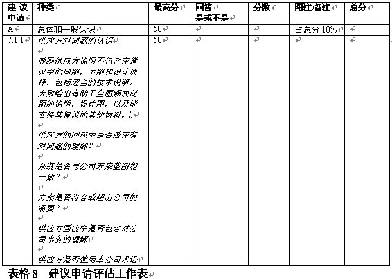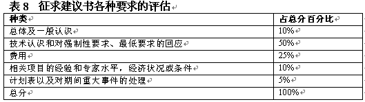 。。在決定了初步要求之后,評(píng)估小組應(yīng)具體地開展評(píng)估工作。具體評(píng)估的目標(biāo)是通過(guò)給建議書主要方面打分作出評(píng)估?梢栽谒愠鼋ㄗh書各方面占總分?jǐn)?shù)的百分比,如表8中對(duì)各方面的總覽。一般在建議書內(nèi)向提供者給出這一信息。
