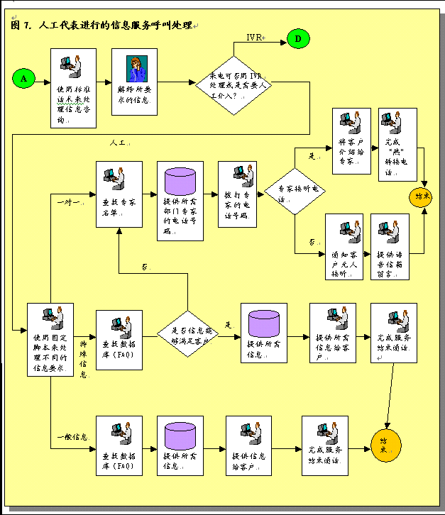 各部門也需要修改步驟處理和完成服務(wù)請(qǐng)求,F(xiàn)在,大多數(shù)公司個(gè)別部門接受和完成服務(wù)請(qǐng)求。許多部門在完成工作之后沒有對(duì)結(jié)果進(jìn)行跟蹤回訪。對(duì)于一些部門服務(wù)請(qǐng)求只是紙上談兵。為了有效的提供呼叫中心服務(wù)并為服務(wù)請(qǐng)求提供信息,各部門必須采用新的步驟。這些步驟應(yīng)包括從服務(wù)請(qǐng)求系統(tǒng)中重新獲取呼叫請(qǐng)求信息,跟蹤這些請(qǐng)求,工作完成后更新服務(wù)請(qǐng)求系統(tǒng)。對(duì)于沒有信息系統(tǒng)和目前使用人工操作的部門,要達(dá)到這一工作要求就需要設(shè)計(jì)和實(shí)施新的程序和系統(tǒng)。