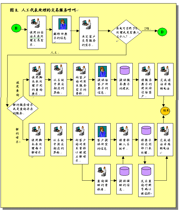 圖3概述了呼叫中心服務(wù)呼叫處理過程。描述了進(jìn)入呼叫中心系統(tǒng)的各種呼叫如何完成處理過程,或者由真人代表完成,或者是通過IVR技術(shù)完成。