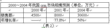 國內(nèi)CRM市場經(jīng)過一段時間的快速增長,2000年銷售額達(dá)到4500萬元左右。2001年市場情況將更好,預(yù)計(jì)銷售額將是上年的兩倍左右。CCID根據(jù)大量調(diào)查分析,對我國CRM市場規(guī)模作出如下預(yù)測: