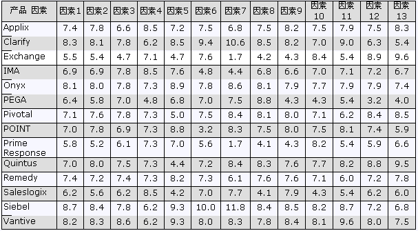 下表摘自Gartner Group 2000年六月份對(duì)14種CRM廠(chǎng)商和產(chǎn)品的比較。原來(lái)的報(bào)告以柱狀圖的形式進(jìn)行比較,為了縮短篇幅,我們轉(zhuǎn)化為表格形式借以引用。