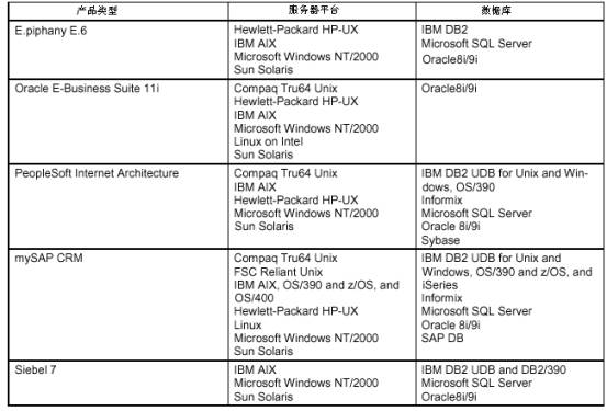 環(huán)境是企業(yè)在選擇軟件的過程中最簡單的技術架構的評估標準,而且是最容易區(qū)分的。最重要的環(huán)境就是CRM產品所支持的服務器平臺和數(shù)據(jù)庫。在你選擇CRM產品時,最好不要改變你現(xiàn)有的服務器平臺和數(shù)據(jù)庫標準,否則你將會增加很多投資。因此一個CRM產品最好要支持你的企業(yè)原有環(huán)境。下表列出了那5家產品的技術架構的環(huán)境。