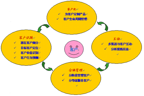 流程涉及到客戶生命周期管理、知識(shí)管理的流程。具體來(lái)說(shuō),流程涉及到兩大方面,其一,CRM成功實(shí)施后的企業(yè),應(yīng)該在業(yè)務(wù)流程上一個(gè)變革。企業(yè)各個(gè)部門開展業(yè)務(wù)的共同前提是:以客戶為中心。其二,企業(yè)應(yīng)當(dāng)通過(guò)CRM來(lái)建立一種客戶管理的優(yōu)化流程,從客戶識(shí)別,到分級(jí)管理,再到企業(yè)與客戶互動(dòng),再到為客戶定制產(chǎn)品;然后循環(huán)往復(fù)。具體我們可以參見下圖: