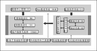 在信息技術(shù)管理子系統(tǒng)中,CRM的各功能模塊和相關(guān)系統(tǒng)運行都必須由先進的技術(shù)、設備、軟件來保障,主要的內(nèi)容可以分為以下四類:其他子系統(tǒng)應用軟件管理,如數(shù)據(jù)庫管理系統(tǒng)、電子軟件分發(fā)系統(tǒng)等;中間軟件和系統(tǒng)工具的管理,如中間軟件系統(tǒng)、系統(tǒng)執(zhí)行管理工具等;企業(yè)級系統(tǒng)的集成管理,如CRM與企業(yè)管理信息系統(tǒng)的集成,乃至整個的企業(yè)應用集成方案,以實現(xiàn)將企業(yè)的CRM與ERP、SCM等系統(tǒng)緊密集成;電子商務技術(shù)和標準的管理,如Internet技術(shù)、EDI技術(shù)及標準、通信標準的管理等。為支持無線應用,CRM技術(shù)管理子系統(tǒng)將提供與手機、PDA、智能家電等工具的通訊接口,采用J2EE或.NET技術(shù)平臺,以及在支持無線傳輸和無線LAN應用等方面進行相應的調(diào)整。