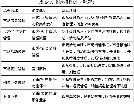 根據(jù)CRM軟件的總體目標(biāo),項目組詳細審核每個業(yè)務(wù)的流程,并按照流程對軟件進行定制。所制定的流程包括三大業(yè)務(wù)領(lǐng)域的業(yè)務(wù),見表24.3。