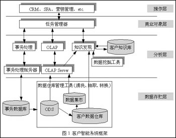 圖1描述了一個典型的客戶智能系統(tǒng)體系結(jié)構(gòu)。面向特定的應(yīng)用,客戶智能的體系結(jié)構(gòu)會有所改進,以使系統(tǒng)與具體的業(yè)務(wù)相符。例如:建立何種數(shù)據(jù)存貯和數(shù)據(jù)模型能很好地支持主題,支持客戶數(shù)據(jù)分析和客戶知識發(fā)現(xiàn)的需要;選擇何種決策分析工具;將發(fā)現(xiàn)的客戶知識通過何種接口傳送給相應(yīng)的用戶等等,都需要實際情況結(jié)合起來考慮。