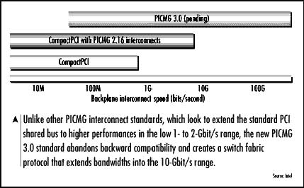 PICMG是CompactPCI的升級標準,但是與CompactPCI有很大的不同,CompactPCI是共享式總線結(jié)構(gòu),而PICMG提供了交換式連接,每個點到點的連接能達到10Gbps的帶寬。圖1所示為幾種技術(shù)的互聯(lián)帶寬比較。PICMG標準的提出主要是針對電信行業(yè)方面的應用,因此在供電方面采用了電信界的雙-48V電源標準,而非CompactPCI的ATX電源標準。因此,PICMG標準與CompactPCI在很大程度上不兼容。