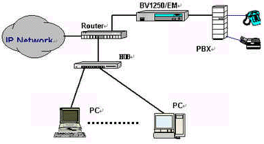 OKI公司的IVG BV1250互聯(lián)網(wǎng)絡(luò)IP電話語音網(wǎng)關(guān)就是一種非常好的選擇,完全基于H.323 Ver2.0協(xié)議,實(shí)現(xiàn)語音和傳真在因特網(wǎng)上傳輸。使用BV1250 進(jìn)行IP電話和IP FAX通信時(shí),可以感覺到與傳統(tǒng)的電話或傳真所提供的服務(wù)毫無區(qū)別。運(yùn)用BV1250,可通過互聯(lián)網(wǎng)(Internet/Intranet)將電話機(jī)、傳真機(jī)和PBX進(jìn)行互連,建立專用的IP電話網(wǎng)絡(luò)。BV1250使用的是靜態(tài)IP地址,因此不能將BV1250連接到使用DHCP(動(dòng)態(tài)主機(jī)通信規(guī)程)的互聯(lián)網(wǎng)上。常用連接方式如下圖所示: