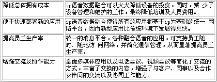 人們常常認(rèn)為語音數(shù)據(jù)融合帶來的明顯優(yōu)勢(shì)只是成本下降,其實(shí),事實(shí)遠(yuǎn)不止如此,語音、視頻、數(shù)據(jù)統(tǒng)一傳輸?shù)男录夹g(shù)必然帶來許多新的網(wǎng)絡(luò)應(yīng)用和解決方案。這些創(chuàng)新的多媒體解決方案可以開發(fā)成供應(yīng)鏈管理、電子商務(wù)、客戶服務(wù)、生產(chǎn)效率、電子教學(xué)當(dāng)中的應(yīng)用,幫助企業(yè)將傳統(tǒng)業(yè)務(wù)處理和國際互聯(lián)網(wǎng)結(jié)合起來,形成一種嶄新的經(jīng)濟(jì)模式。其作用是將信息流遍布整個(gè)企業(yè)的銷售、研發(fā)、管理、服務(wù)等各個(gè)流程。對(duì)內(nèi)加快信息流通,加強(qiáng)員工、生產(chǎn)的管理,提高運(yùn)作效率。對(duì)外提供優(yōu)良的客戶服務(wù),統(tǒng)一供應(yīng)鏈,從而在競爭中脫穎而出。