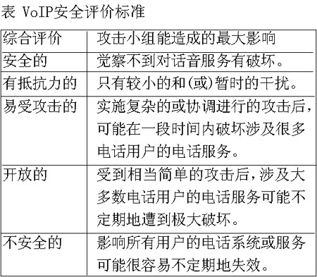 測(cè)試結(jié)果表明,采用了復(fù)雜攻擊手段的攻擊小組無(wú)法破壞思科公司的VoIP網(wǎng)絡(luò),甚至無(wú)法對(duì)其造成顯著的干擾。這套精心制造的IP電話系統(tǒng)(包括第二層和第三層基礎(chǔ)設(shè)施以及各式各樣的附加安全軟件)是“安全的”(參見(jiàn)表中所示的VoIP安全評(píng)價(jià)標(biāo)準(zhǔn)),它最大限度地全面發(fā)揮了思科公司的網(wǎng)絡(luò)安全專長(zhǎng),利用了思科公司擁有的每一種防御武器。