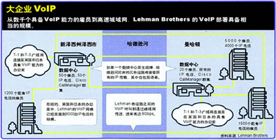Lehman Brothers利用Cisco CallManager IP PBX向全球的雇員提供語音服務(wù)。該公司的IP PBX位于公司在曼哈頓和新澤西城的冗余數(shù)據(jù)中心內(nèi)。公司從2001年初先期部署了容量為50部電話的VoIP網(wǎng)絡(luò)。該系統(tǒng)在當年年中時已經(jīng)增容至1000個用戶。目前,這套VoIP網(wǎng)絡(luò)已經(jīng)增加至8000個IP電話,用戶遍及紐約地區(qū)、英國和日本。該公司負責(zé)網(wǎng)絡(luò)服務(wù)的副總裁John