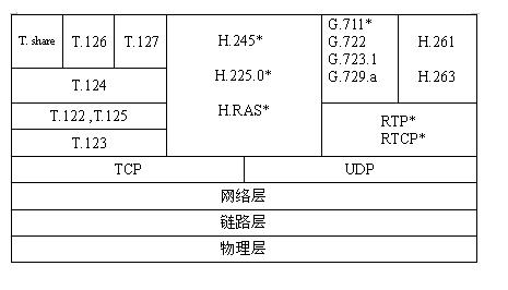 為網絡電話和可視電話會議系統(tǒng)的進一步發(fā)展和系統(tǒng)的兼容性提供了良好的條件。其中系統(tǒng)控制協(xié)議包括H.323、H.245、和H.225.0,Q.931和RTP/RTCP是H.225.0的主要組成部份。系統(tǒng)控制是H.323終端的核心。整個系統(tǒng)控制由H.245控制信道、H.225.0呼叫信令信道和RAS(注冊、許可、狀態(tài))信道提供,音頻編解碼協(xié)議包括G.711協(xié)議(必選)、G.722、G.723.1、G.728、G.729等協(xié)議。編碼器使用的音頻標準必須由H.245協(xié)議協(xié)商確定。H.323終端應由對本身所具有的音頻編解碼能力進行非對稱操作。如以G.711發(fā)送,以G.729接收。視頻編解碼協(xié)議主要包括H.261協(xié)議(必選)和H.263協(xié)議。H.323系統(tǒng)中視頻功能是可選的。數據會議功能也是可選的,其標準是多媒體會議數據協(xié)議T.120。其結構如圖所示。