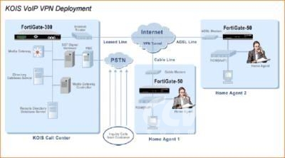 KOIS利用FortiGate網(wǎng)絡(luò)安全網(wǎng)關(guān)在保持所需要的性能級別和系統(tǒng)需求的基礎(chǔ)上全面保護了VPN的數(shù)據(jù)網(wǎng)絡(luò)。FortiGate-300網(wǎng)絡(luò)安全網(wǎng)關(guān)安全在呼叫中心,F(xiàn)ortiGate-50安裝在每個家庭代理中。