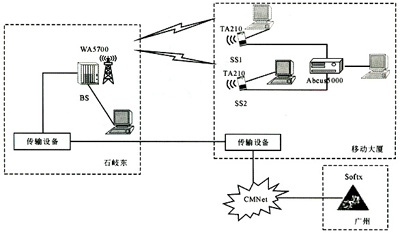 組網(wǎng)時(shí),由于BS(石岐東)需要與廣州的SoftX連接,因此,實(shí)際組網(wǎng)方案通過傳輸設(shè)備連接公安局與移動大廈;然后通過移動大廈的CMNet網(wǎng)絡(luò)連接廣州的SoftX。在該個(gè)組網(wǎng)中,視距傳播環(huán)境通過固定在移動大樓支架上的遠(yuǎn)端站實(shí)現(xiàn),非視距傳播環(huán)境通過移動的遠(yuǎn)端站實(shí)現(xiàn)。