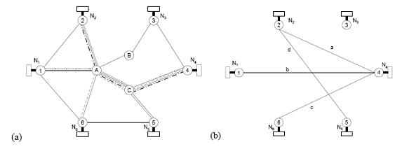 網(wǎng)絡(luò)拓?fù)淙鐖D3(a)所示,以鏈路A-C為例,將通過(guò)鏈路A-C的端到端的呼叫分別表示為a, b, c, d,如圖3(b)所示, (i =