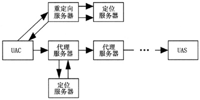 如圖2所示,SIP網(wǎng)絡(luò)采用IP網(wǎng)絡(luò)常用的客戶機(jī)/服務(wù)器(C/S)結(jié)構(gòu),定義了若干種不同的服務(wù)器和用戶代理,通過(guò)與服務(wù)器之間的請(qǐng)求和響應(yīng)完成呼叫和傳送層的控制。