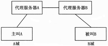 圖3給出了上述SIP消息選路過(guò)程。主叫A接入A域的代理服務(wù)器A后,代理服務(wù)器A查詢DNS,得到B域的代理服務(wù)器B的地址。最后由代理服務(wù)器B將invite消息發(fā)送至被叫B。在軟交換網(wǎng)絡(luò)中,代理服務(wù)器A和代理服務(wù)器B的功能都由軟交換機(jī)實(shí)現(xiàn)。