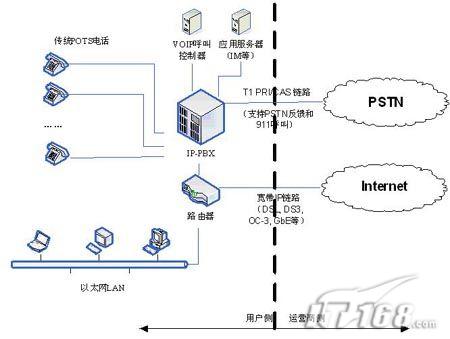 圖2顯示了從傳統(tǒng)的中央交換機(jī)業(yè)務(wù)向基于IP的中央交換機(jī)業(yè)務(wù)轉(zhuǎn)換的一個(gè)具有可行性的解決方案體系結(jié)構(gòu),這個(gè)方案盡量使得用戶側(cè)客戶端對(duì)于基礎(chǔ)設(shè)施的投資最小化,而運(yùn)營(yíng)商對(duì)此的投資回報(bào)則會(huì)相對(duì)較多(Internet服務(wù)提供商,ISP相對(duì)較少,而電信運(yùn)營(yíng)商更多)。更具體來(lái)講,部署成本取決于設(shè)備接口和服務(wù)的需求、部署的范圍、備的使用年限、現(xiàn)有可用的IP網(wǎng)絡(luò)基礎(chǔ)設(shè)施等等,因此每個(gè)具體的解決方案需要單獨(dú)地核算成本。