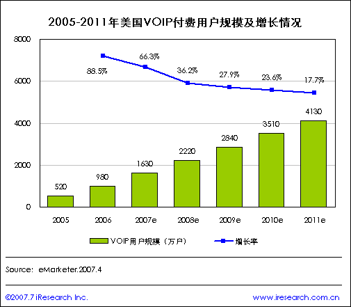 2011年美國VOIP付費用戶規(guī)模將達4130萬戶