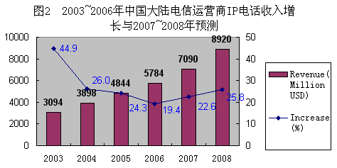 圖2:2003-2006年中國(guó)大陸電信運(yùn)營(yíng)商IP電話收入增長(zhǎng)及2007-2008年預(yù)測(cè)。