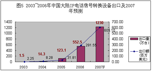 圖5:2003-2006年中國(guó)大陸IP電話信號(hào)轉(zhuǎn)換設(shè)備出口及2007年預(yù)測(cè)。