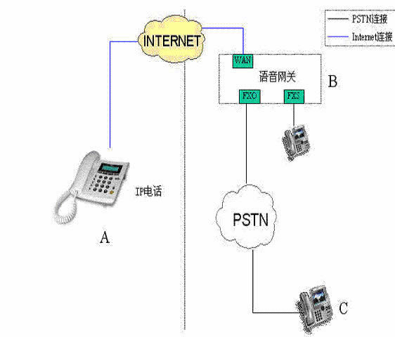 反之如果B點(diǎn)的當(dāng)?shù)仉娫捰脩鬋,透過電話撥接到B點(diǎn)的FXO口,然后利用INTERNET網(wǎng)絡(luò)轉(zhuǎn)接回A點(diǎn),這就是上車。