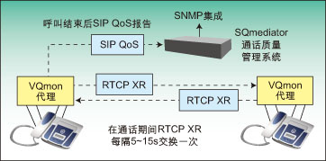 圖2顯示了如何在IP網(wǎng)絡(luò)上使用行業(yè)標(biāo)準(zhǔn)覆蓋質(zhì)量管理系統(tǒng)。圖中顯示了嵌入式軟件探測(cè)裝置,如IP話機(jī)中的行業(yè)標(biāo)準(zhǔn)VQMon代理,它們可實(shí)時(shí)監(jiān)測(cè)通話質(zhì)量。這些代理可生成RTCP