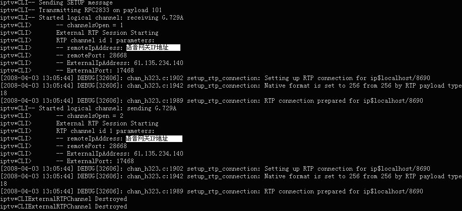 表示軟交換Asterisk與華為8010語音網(wǎng)關(guān)的H323連接在此釋放