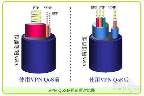 一般情況下VPN線路帶寬所表現(xiàn)出來的時大時小、斷斷續(xù)續(xù)、甚至中斷等等不夠用或不穩(wěn)定的情況,在使用VPN QoS以后可得到根本的好轉(zhuǎn),它可以對VPN總體帶寬進行大小分配,進行優(yōu)先而穩(wěn)定的保證。有了足夠的VPN線路帶寬,才能快速的進行VoIP、ERP等應用。因此保證VPN整體帶寬是VPN應用的基礎。