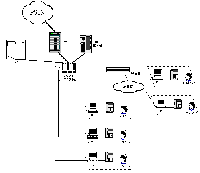 呼叫中心,早期是指一個由兩人或更多人組成的、在一個特定地方用專用設備處理電話業(yè)務的小組。這些人就是通常所說的呼叫中心代理(人)。一個呼叫中心可以只提供信息接收服務,或者只提供信息發(fā)送服務,或者是一個混合式呼叫中心,其呼叫中心代理會負責所有這兩項工作。從物理設備構(gòu)成來看,第一代呼叫中心可用下圖(1)、(2)表示。