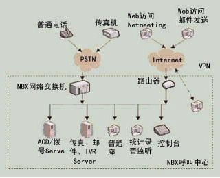 NBX呼叫中心是基于3Com公司NBX網(wǎng)絡電話交換機平臺構(gòu)筑的、語音數(shù)據(jù)合一的呼叫中心。系統(tǒng)配置拓撲結(jié)構(gòu)如圖3所示。