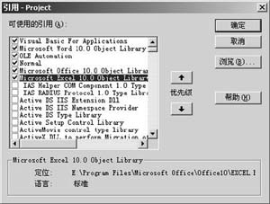 打開VBA編輯器,從工具選單中選擇引用命令,選定Microsoft Excel 10.0對象庫并確定(見圖2)。
