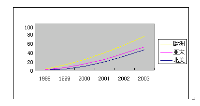 圖4顯示了UM產(chǎn)品和服務(wù)從1998到2003年的收入增長預(yù)測。UM產(chǎn)品和服務(wù)市場在2003年的總體收入預(yù)計為100億美元左右。圖5顯示統(tǒng)一消息郵箱的三個UM市場(北美、歐洲和亞太地區(qū))增長預(yù)測。