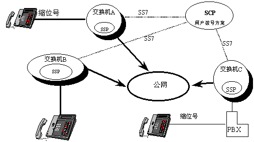 縮位撥號(hào)是指用一短的撥號(hào)(如三位)代替一長(zhǎng)的撥號(hào)(如八位)的撥號(hào)方案。如下圖所示的智能網(wǎng)中,交換機(jī)A、B、C所有用戶的撥號(hào)方案數(shù)據(jù)都由SCP管理,當(dāng)交換機(jī)收到用戶的縮位撥號(hào)后,通過SS7鏈路訪問SCP數(shù)據(jù)庫(kù),返回對(duì)應(yīng)的電話號(hào)碼,然后交換機(jī)通過公網(wǎng)把呼叫接通到該電話號(hào)碼,就和用戶直接撥打該電話號(hào)碼一樣。