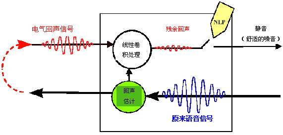 符合ITU G.168(2000)標(biāo)準(zhǔn)的回聲消除器能夠消除電氣(混合)回聲。這類設(shè)備在其運行當(dāng)中采用了"兩段式"方法。在第1階段,使用線性卷積處理消除了大部分回聲。在第2階段,采用了非線性處理器(NLP)以消除殘存的回聲,這一部分相對較小。對殘存回聲信號的辨識是一件很簡單的任務(wù),這是因為它的功率電平明顯低于原始的語音信號。