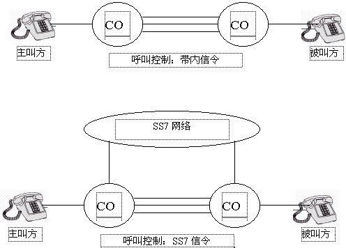 在任一個(gè)電話系統(tǒng)中,都要規(guī)定一些固定的信令機(jī)制來實(shí)現(xiàn)呼叫的建立和釋放。最初,象POTS(普通舊電話業(yè)務(wù))那樣的電話系統(tǒng)都是用帶內(nèi)信令來傳遞信息。帶內(nèi)信令是指信號(hào)的頻率在話音頻率范圍之內(nèi)(0.3~3.4kHz),比如:DTMF信號(hào)就屬于帶內(nèi)信號(hào)。帶內(nèi)信號(hào)是在話音通道內(nèi)傳遞的。相反,SS7使用一個(gè)完全獨(dú)立于話音網(wǎng)的數(shù)據(jù)網(wǎng)來傳遞信令,這樣可以大大提高電話網(wǎng)絡(luò)的利用率。比如,在呼叫發(fā)起但未建立完成之前,不需要分配話音電路,這使得傳遞的信令數(shù)據(jù)只和呼叫有關(guān)而和電路無(wú)關(guān),為在交換機(jī)之間、交換機(jī)和其它網(wǎng)絡(luò)之間高效、可靠地傳遞信息提供了可能。同時(shí)也支持更高級(jí)的應(yīng)用,如:主叫識(shí)別、無(wú)線漫游和800號(hào)業(yè)務(wù)。如下圖1,顯示出了帶內(nèi)信令和SS7在呼叫接續(xù)上的區(qū)別。
