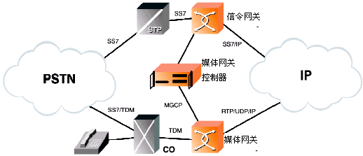 IP電話技術(shù)把話音、傳真數(shù)據(jù)和IP網(wǎng)絡(luò)無縫地集合到了一起。因特網(wǎng)工程任務(wù)組(IETF)已經(jīng)建議了一個(gè)功能模型,來橋接包交換的IP網(wǎng)和電路交換的PSTN,這些橋接設(shè)備就是:信令網(wǎng)關(guān)(SG)、媒體網(wǎng)關(guān)(MG)、和媒體網(wǎng)關(guān)控制器(MGC)。(請參看圖1)。MGC通常又被叫做軟交換,正如它的名字表達(dá)的意思一樣,MGC控制著媒體從電路交換領(lǐng)域經(jīng)過媒體網(wǎng)關(guān)的網(wǎng)絡(luò)傳送到基于包的領(lǐng)域。呼叫控制消息首先送達(dá)SS7信令網(wǎng)關(guān),轉(zhuǎn)換成網(wǎng)關(guān)網(wǎng)絡(luò)中的MGCP(媒體網(wǎng)關(guān)控制協(xié)議)來控制媒體流,完成呼叫的控制、接續(xù)。話音、傳真和圖象介質(zhì)都是從PSTN交換網(wǎng)通過這些新一代的媒體網(wǎng)關(guān)連接到IP網(wǎng)的。