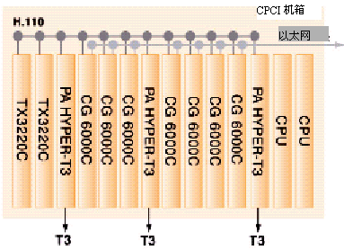 HYPER-T3接入適配板,它用于通過T3線上的1344個(gè)端口從PSTN接入語音和傳真媒體。這些媒體會(huì)從DS3轉(zhuǎn)換到DS0,然后通過H.110總線發(fā)送給6塊CG6000C中的一塊。CG6000C會(huì)壓縮這些語音和傳真媒體,然后用UDP/IP上實(shí)時(shí)協(xié)議(RTP)對它們進(jìn)行打包。再通過板上的兩個(gè)以太網(wǎng)接口發(fā)送到一個(gè)語音級(jí)的IP包網(wǎng)絡(luò)上。請注意,每種板都使用了N+1板卡級(jí)的冗余備份。