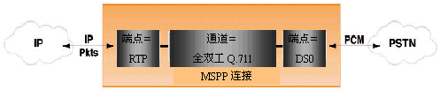MSPP通道可以是全雙工語音編碼器、傳真轉(zhuǎn)發(fā)編碼器、或者是各種單工通道。在一個(gè)普通VoIP網(wǎng)關(guān)應(yīng)用中,一個(gè)端點(diǎn)就是一個(gè)和PSTN連接的DS0,PSTN連接最常見的是CG6000系列平臺(tái)上的T1或E1接口,也可能是T3接口。其它連接是一個(gè)通過以太網(wǎng)接口連接到廣域包網(wǎng)絡(luò)(WAN)的RTP話音包端口。通過指定端點(diǎn)和通道類型,很容易開發(fā)出各種包電話應(yīng)用。