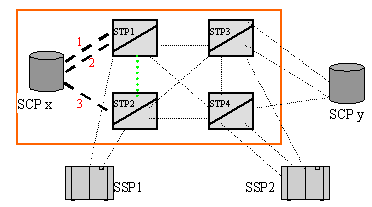 圖中紅色框內(nèi)的網(wǎng)絡包括SCPx,STP1和STP2三個信令點。鏈路1和2構(gòu)成SCPx和STP1之間的鏈路集。鏈路3構(gòu)成SCPx和STP2之間的鏈路集。