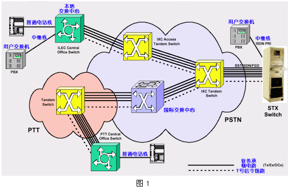 圖1給出了傳統(tǒng)電話網(wǎng)絡PSTN的組織結(jié)構(gòu)圖。它是目前規(guī)模最大的電話業(yè)務網(wǎng)絡,通過標準的信令控制網(wǎng)絡(SS7),成為覆蓋全球的大型電話網(wǎng)絡。這個網(wǎng)絡和Internet互聯(lián)網(wǎng)有著驚人的相似,它們都采用級聯(lián)結(jié)構(gòu),具有易于擴展的特性。
