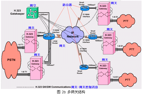 從PSTN來的呼叫被H.323網(wǎng)關受理,把其中的話音流轉(zhuǎn)換成IP數(shù)據(jù)包經(jīng)過IP網(wǎng)絡傳到目的網(wǎng)關下的指定電話終端;同時受理IP網(wǎng)絡來的呼叫(可以來自電腦終端或另一個PTT網(wǎng)絡)轉(zhuǎn)向PSTN目的終端1。