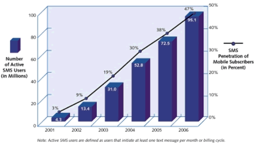 SMS在美國的使用落后于歐洲和日本, 但是工業(yè)分析是預(yù)測它會(huì)很快地趕上來. 請(qǐng)見圖1. 活躍的SMS用戶預(yù)計(jì)會(huì)從2002年的9%增加到2006年的47%.