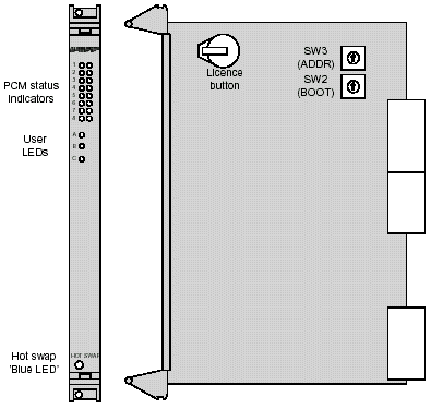 Septel cP板卡的前板上有狀態(tài)指示器。當(dāng)板卡重置以后,所有的PCM狀態(tài)指示器保持開的狀態(tài),直到板卡上的軟件開始運行。